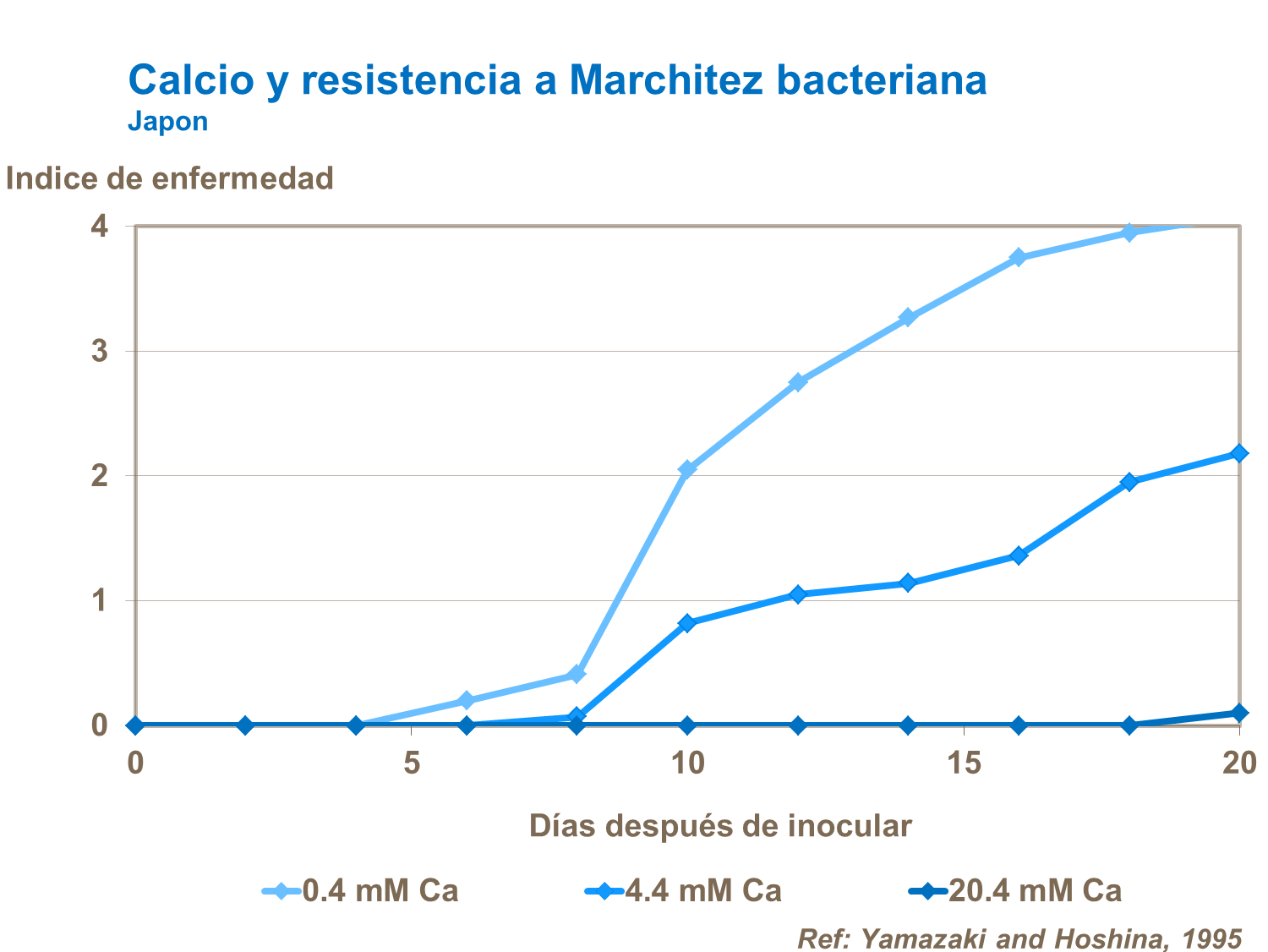 El calcio influye en la resistencia a la marchitez bacteriana o podredumbre basal del tallo en tomates. El calcio soluble y disponible como nitrato de calcio resultó más eficaz que el yeso (sulfato de calcio).