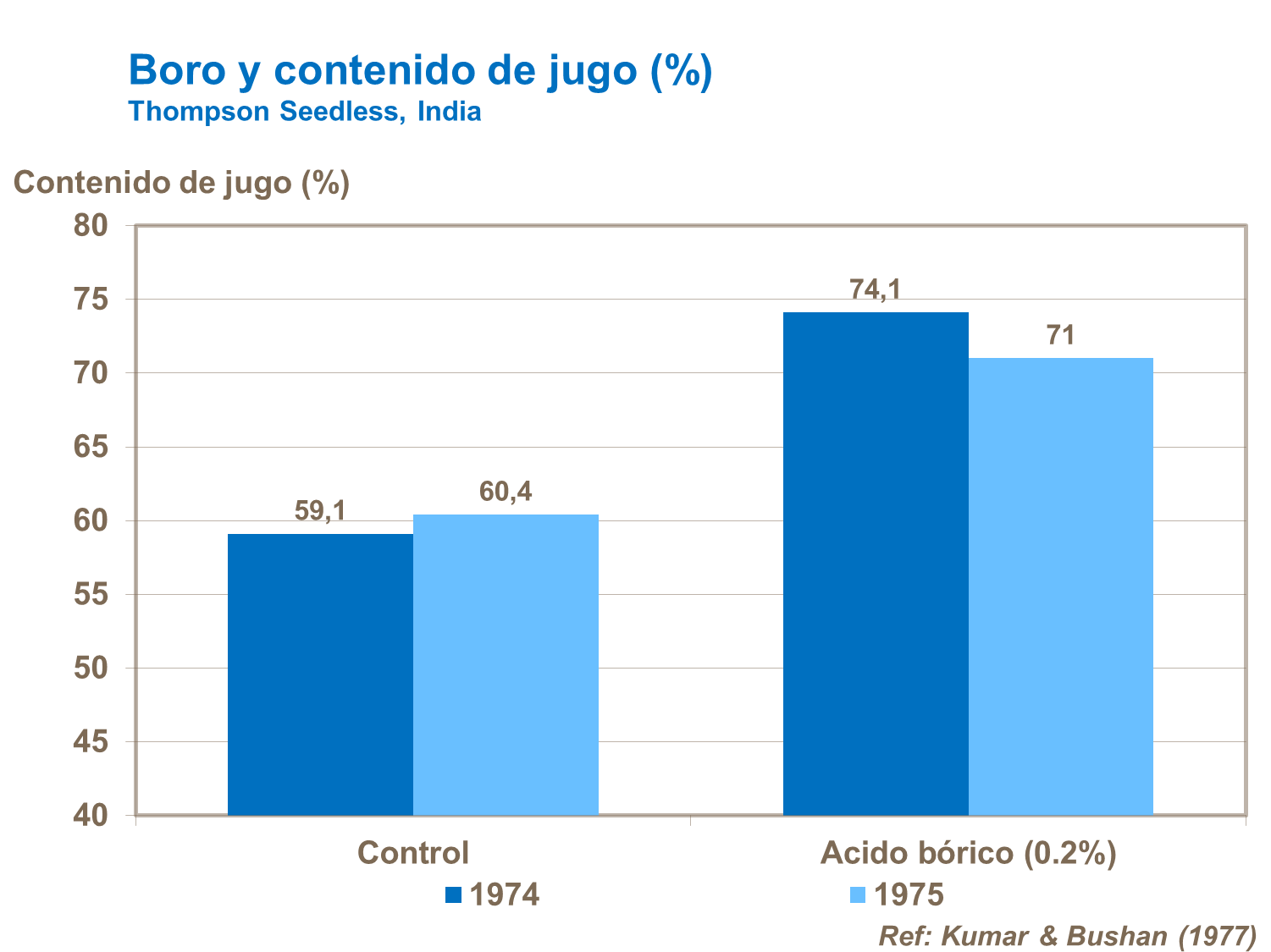 Una secuencia de aplicaciones foliares de boro puede aumentar el contenido de jugo. A través de diversas investigaciones, se ha comprobado que como resultado de aplicaciones de boro, se mejora el crecimiento de la vid.